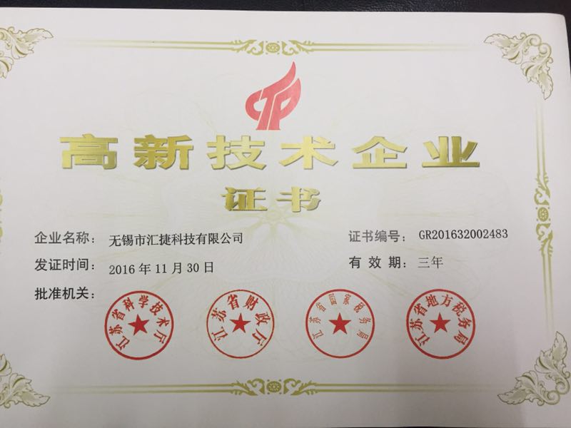 2016年11月30日,無(wú)錫市匯捷科技有限公司順利通過(guò)國(guó)家高新技術(shù)企業(yè)認(rèn)定,獲得高新技術(shù)企業(yè)證書。