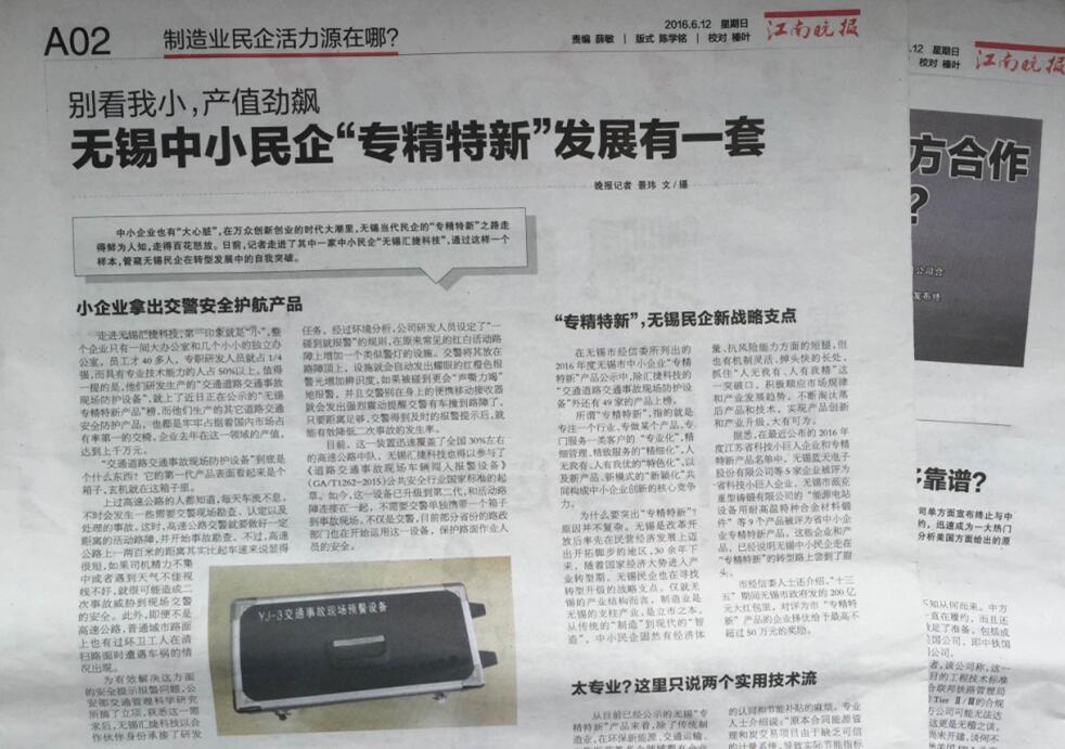 2016年6月12日江南晚報(bào)對我司專精特新產(chǎn)品做了大篇幅的報(bào)道。我司將繼續(xù)走專精特新發(fā)展之路,進(jìn)一步加大研發(fā)投入,不斷提高產(chǎn)品質(zhì)量和附加值,搶占產(chǎn)業(yè)制高點(diǎn)。