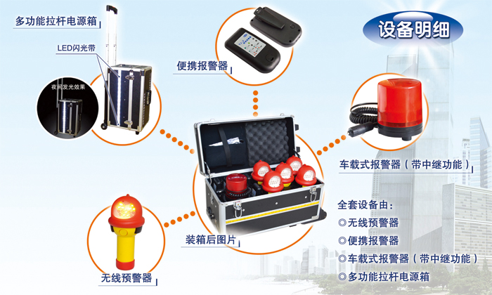 YJ-3 \ YJ-4 type scene of the accident's distance warning device by a wireless warning device, a portable alarm, alarms and vehicle-mounted multi-function power box and other components.