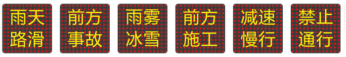 Built-in fixed warning statement: 1. 2. rain slippery snow and fog in front of the accident 3. 4. 5. slow down in front of construction 6. No Entry